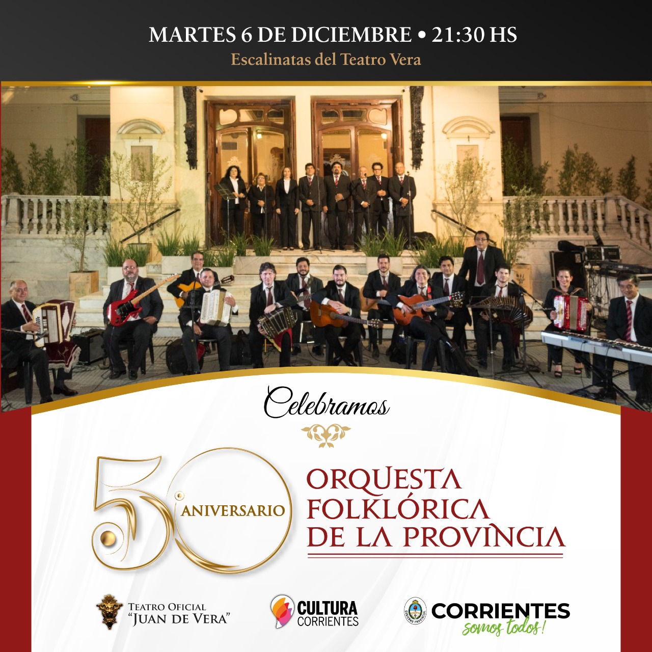 El Gobierno de la Provincia, a través del Instituto de Cultura, junto al pueblo correntino, rendirá tributo a la Orquesta Folclórica de la Provincia, por cumplirse 50 años de su creación. Este acto de reconocimiento se hará el martes 6 de diciembre, desde las 21, en las escalinatas del Teatro Vera.